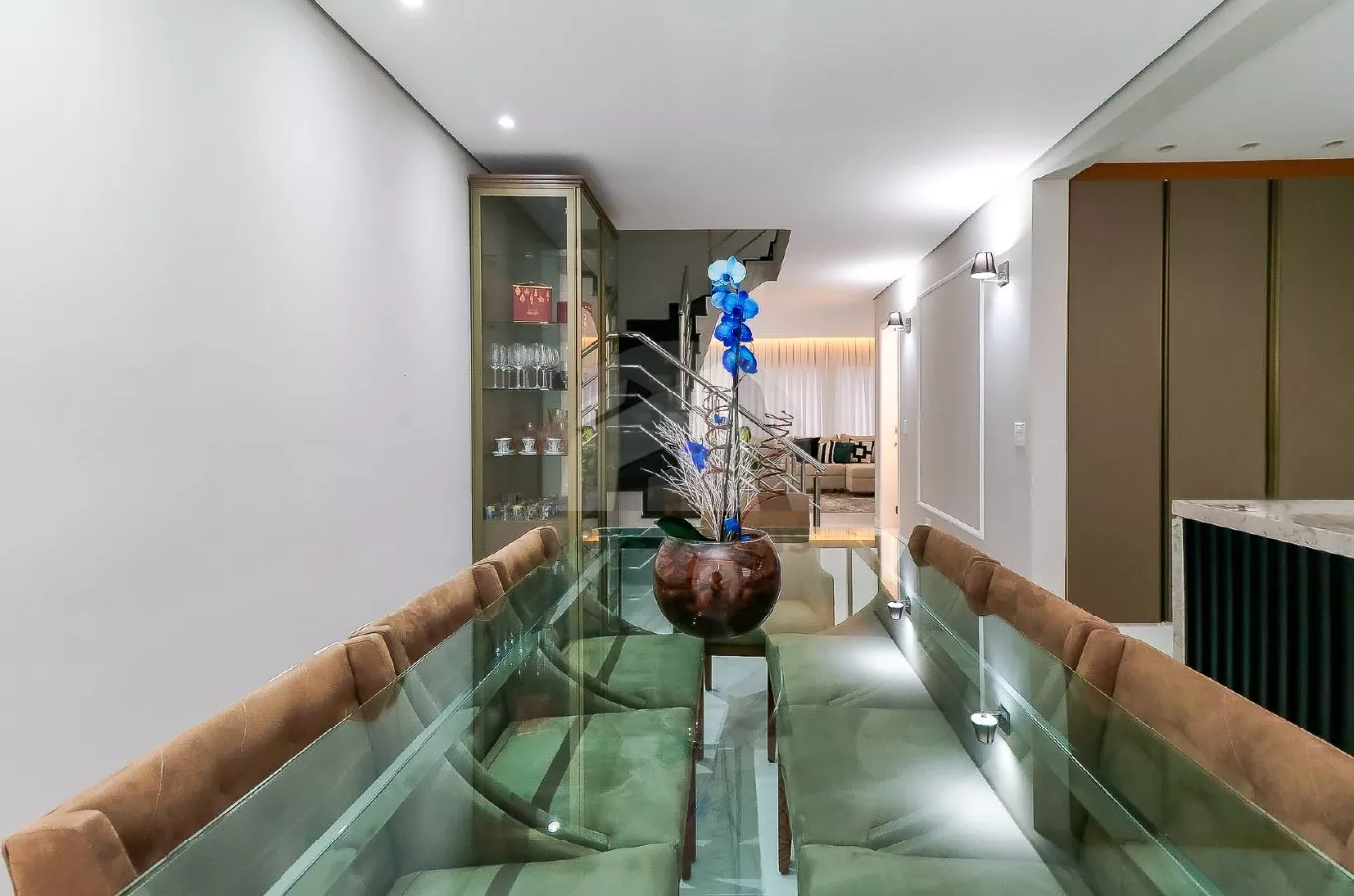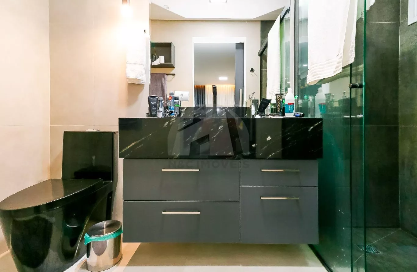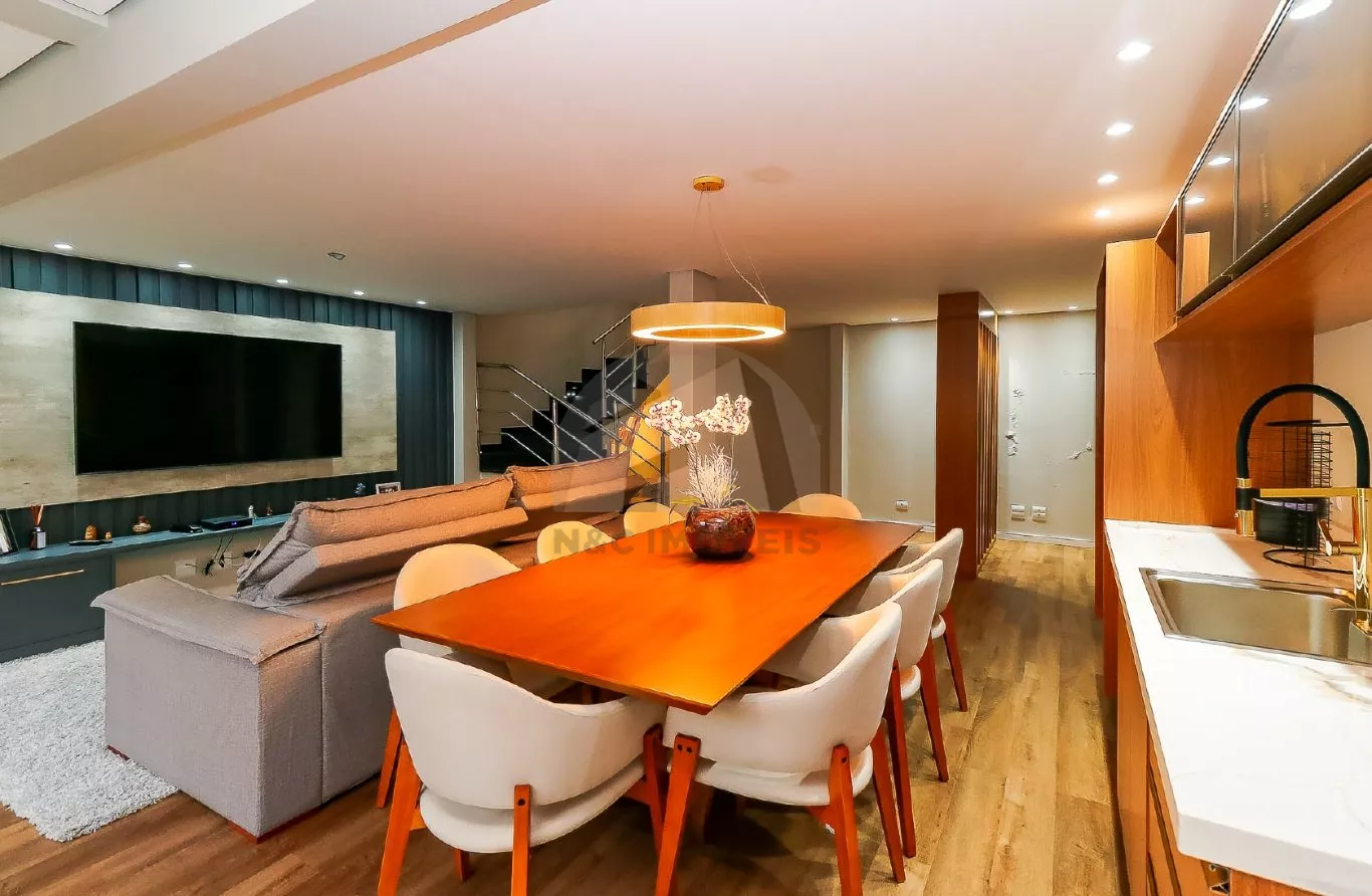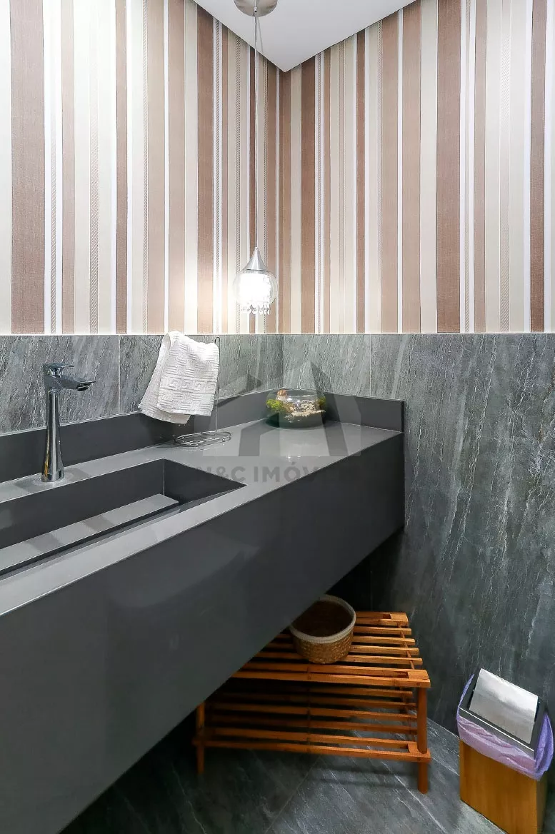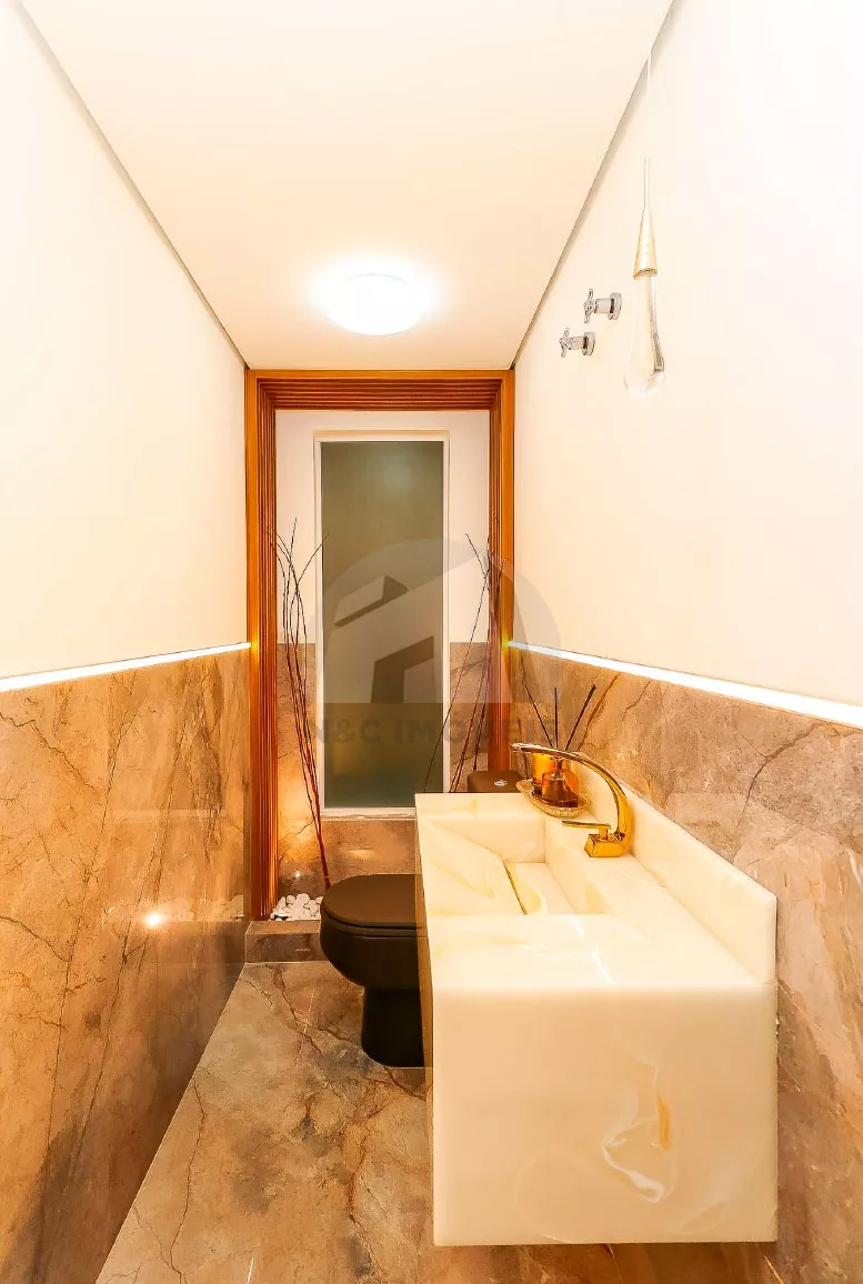 No andar térreo, o imóvel oferece uma sala de entrada elegante, lavabo e uma cozinha com armários planejados integrada à sala de jantar, criando um espaço ideal para receber com conforto. No andar inferior, há uma sala de TV aconchegante, cozinha auxiliar com armários, lavabo, despensa e acesso direto à área gourmet com churrasqueira – perfeita para confraternizações em família.