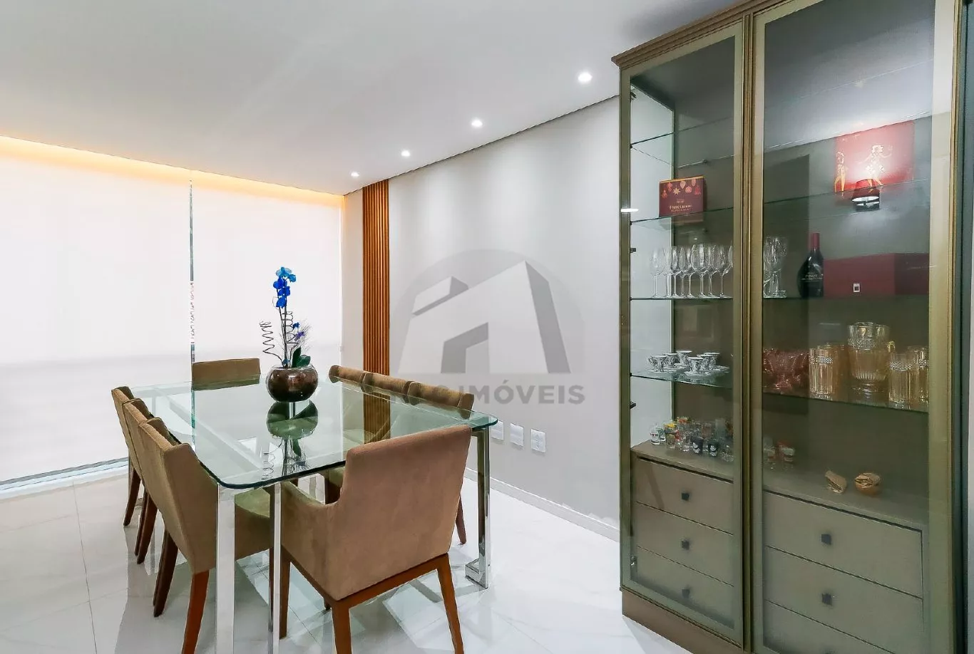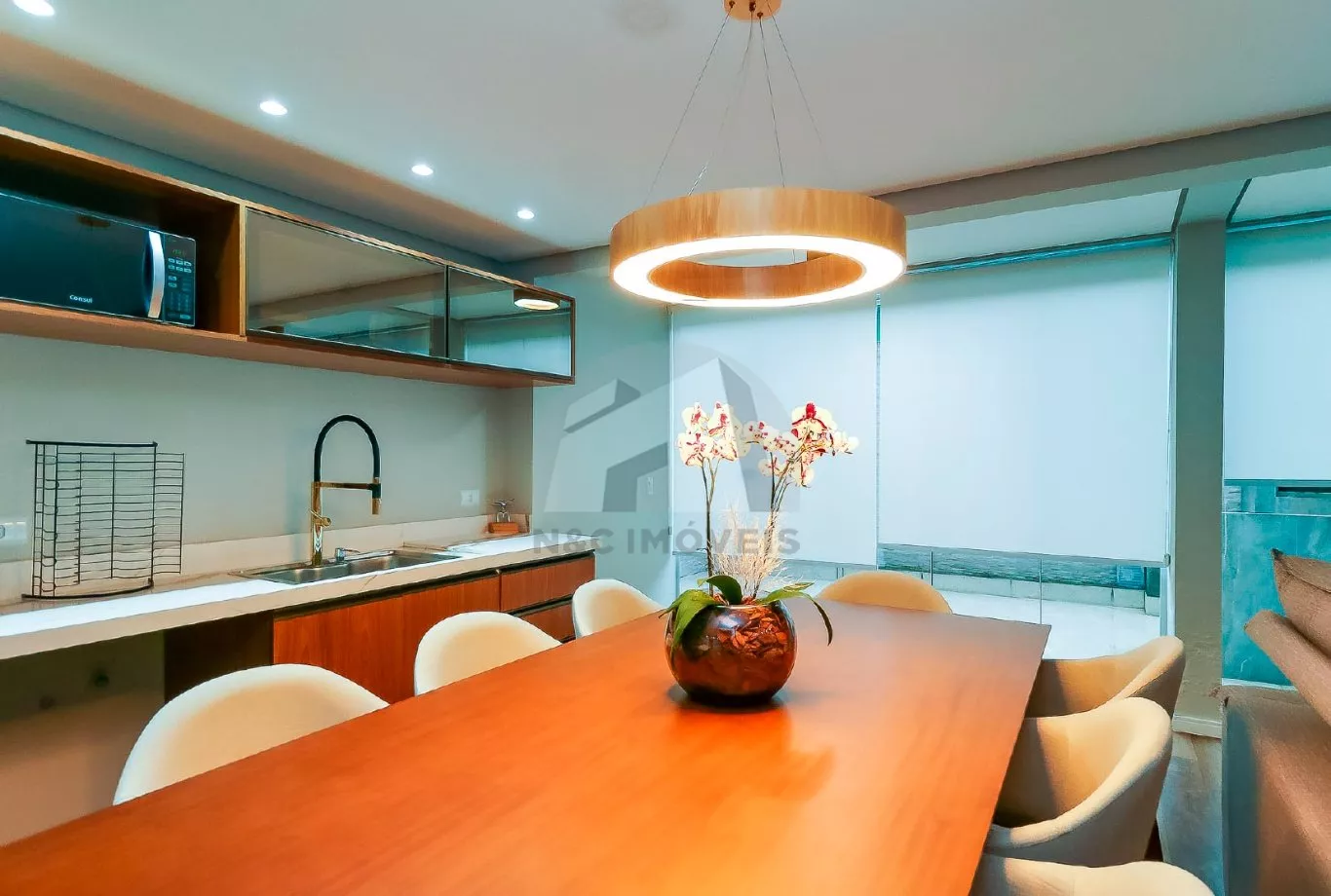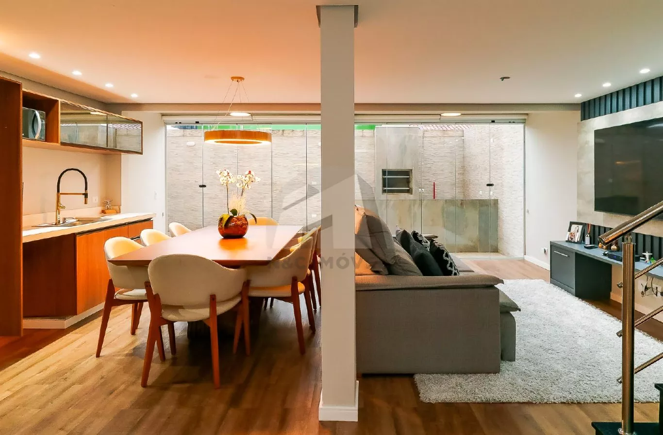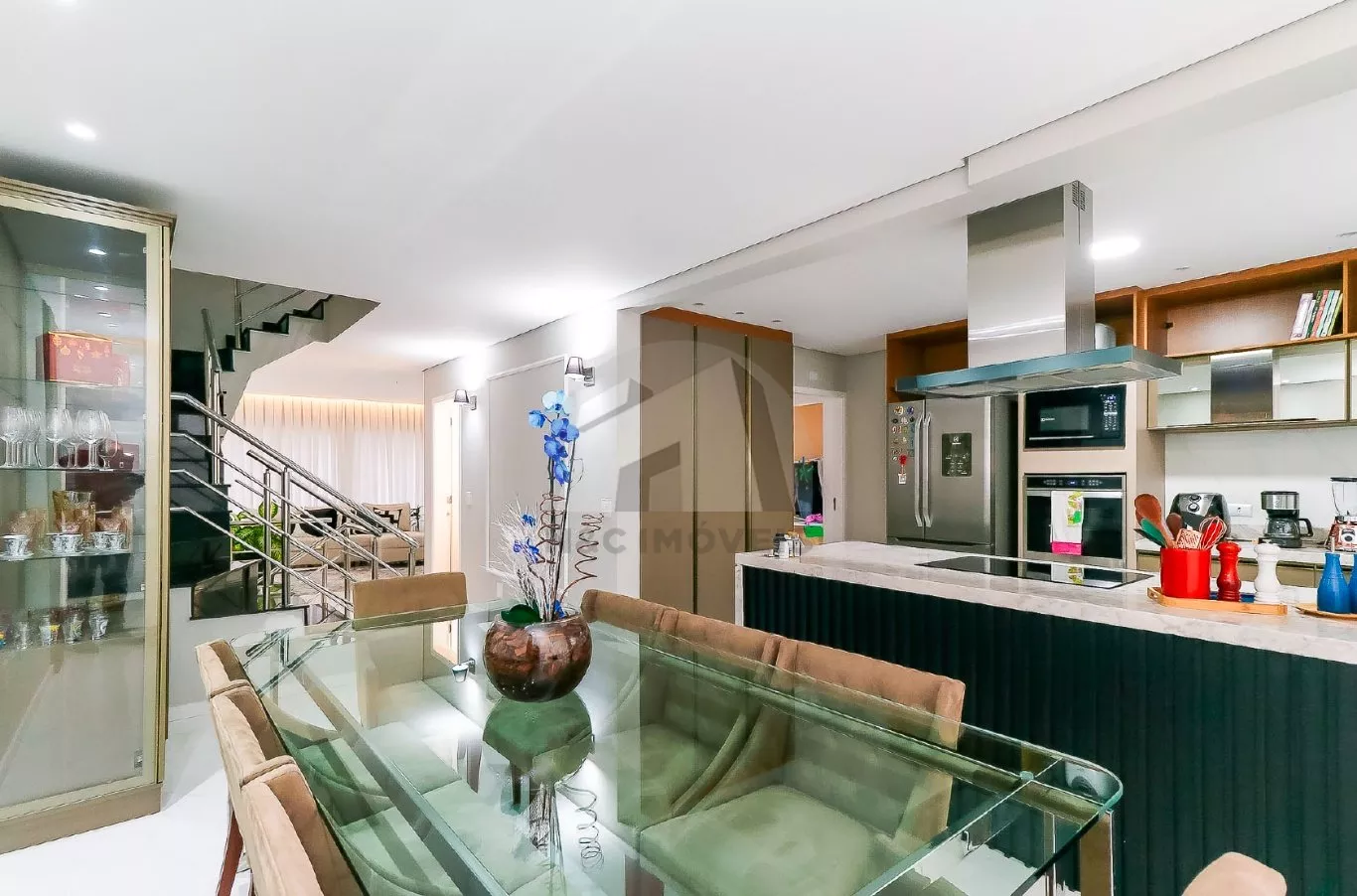No andar térreo, o imóvel oferece uma sala de entrada elegante, lavabo e uma cozinha com armários planejados integrada à sala de jantar, criando um espaço ideal para receber com conforto. No andar inferior, há uma sala de TV aconchegante, cozinha auxiliar com armários, lavabo, despensa e acesso direto à área gourmet com churrasqueira – perfeita para confraternizações em família.