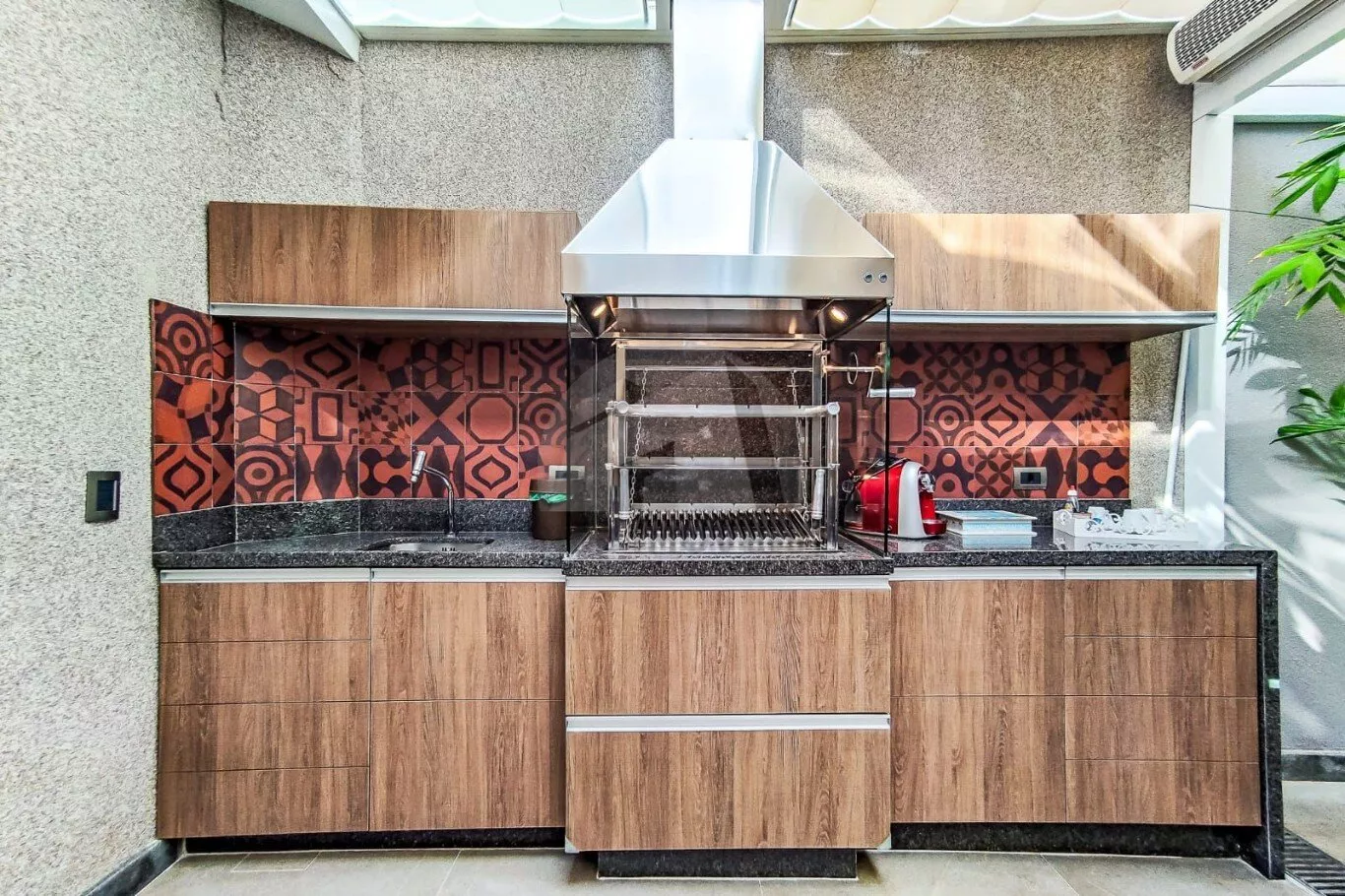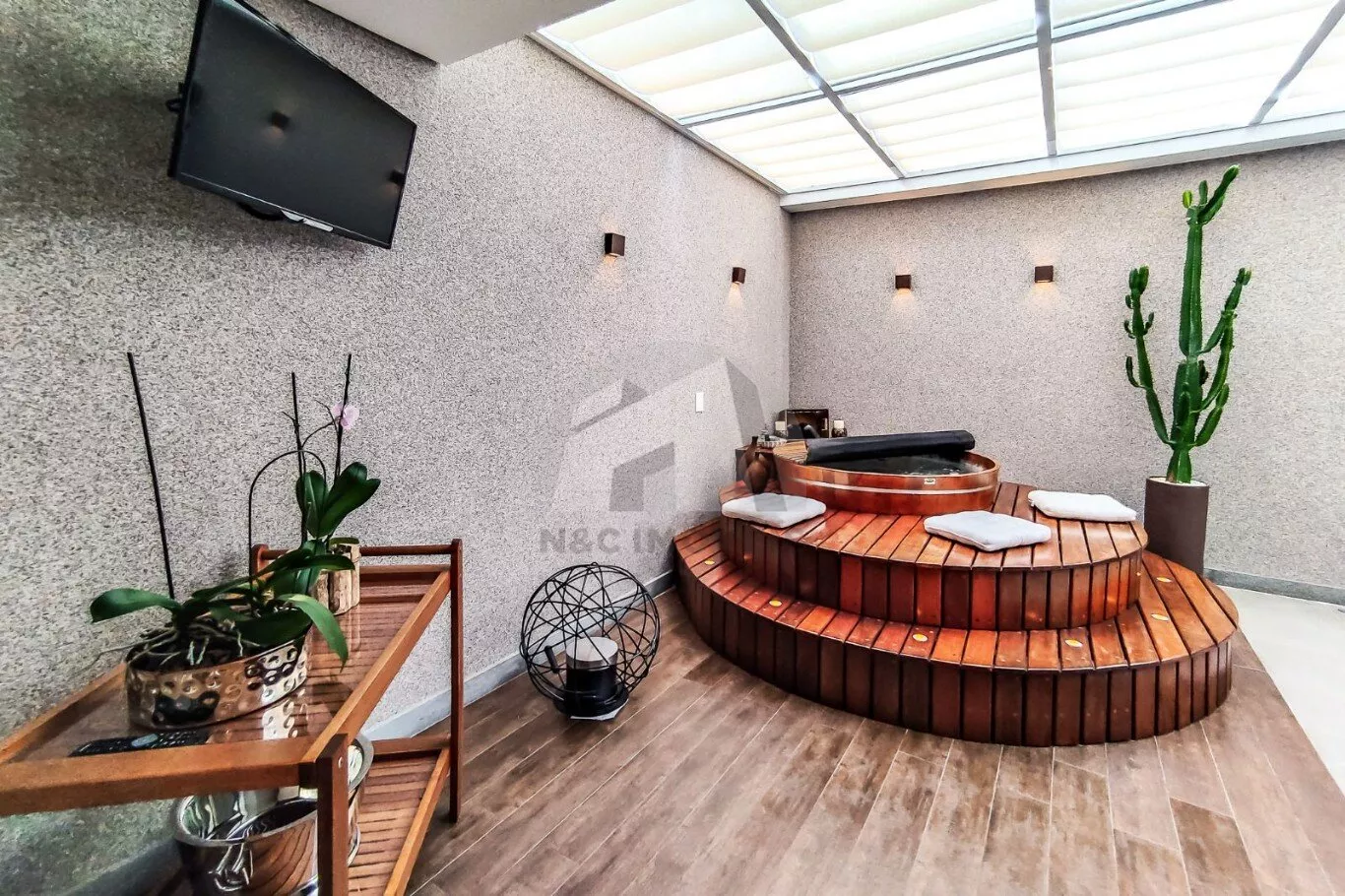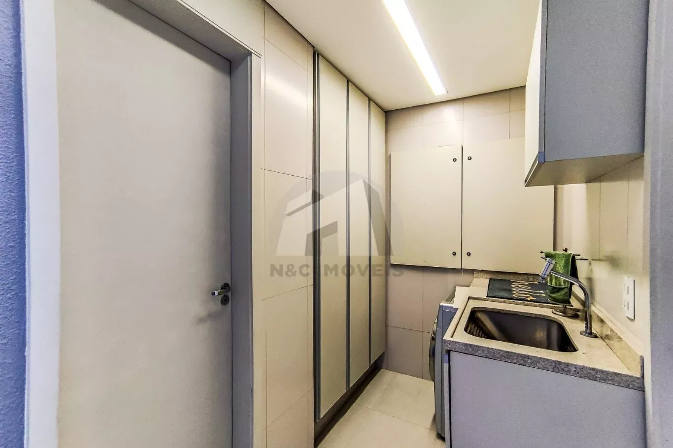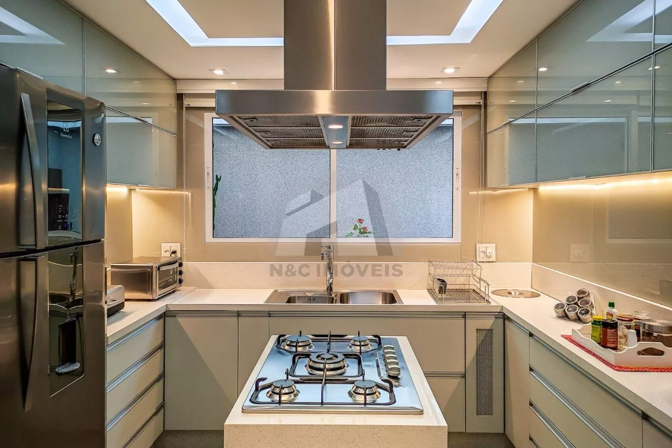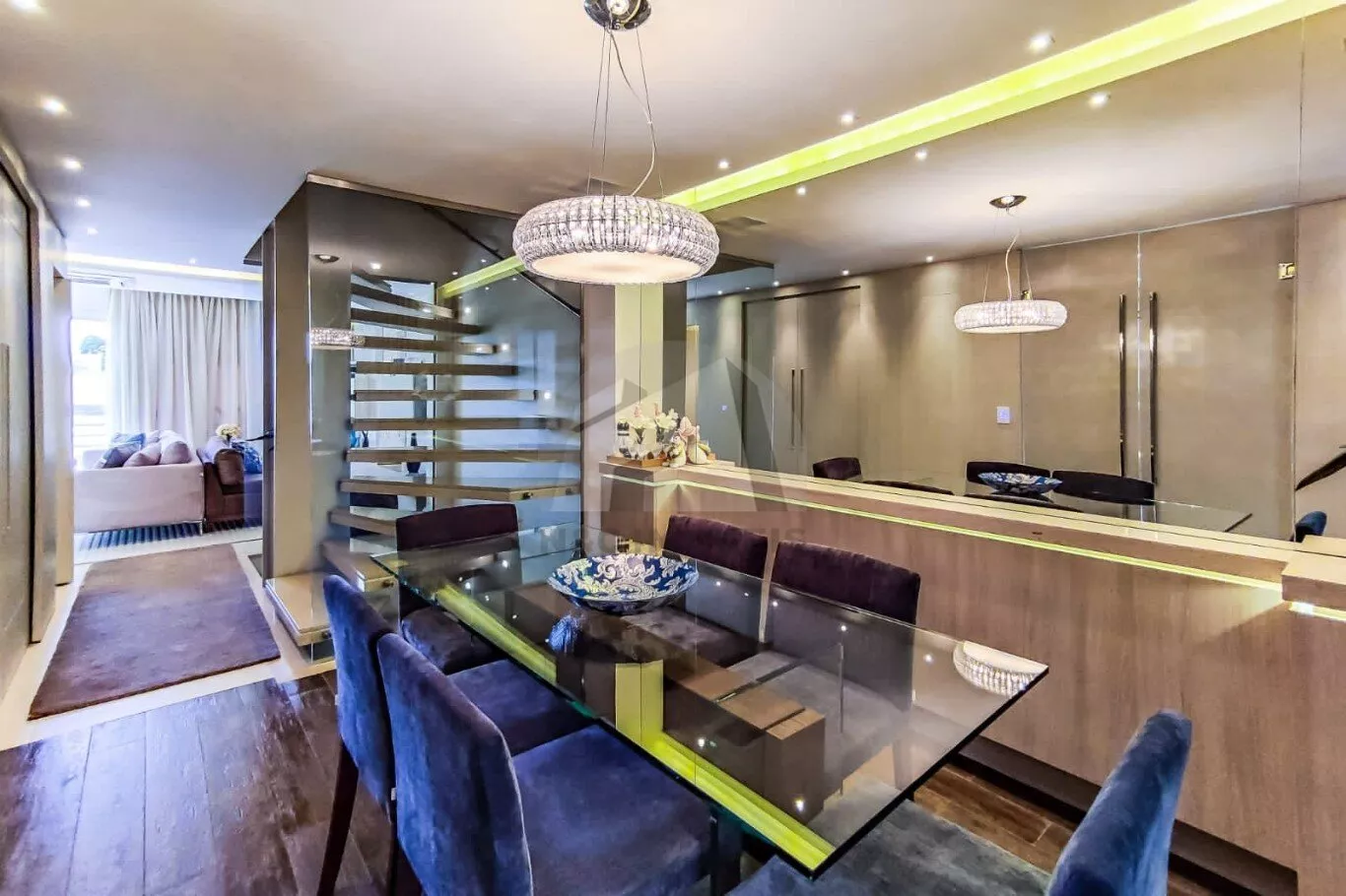 A cozinha é ampla, moderna e equipada com armários planejados, cooktop, exaustor e iluminação em LED. As salas de jantar e estar são integradas, com lareira e ambientes pensados para conforto e convivência. O imóvel ainda conta com banheiro de empregada, área de serviço e um SPA privativo com churrasqueira, perfeito para momentos de lazer e relaxamento.