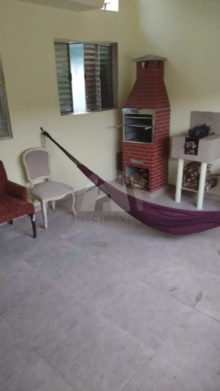 Área de lazer com churrasqueira e fogão a lenha de duas bocas.