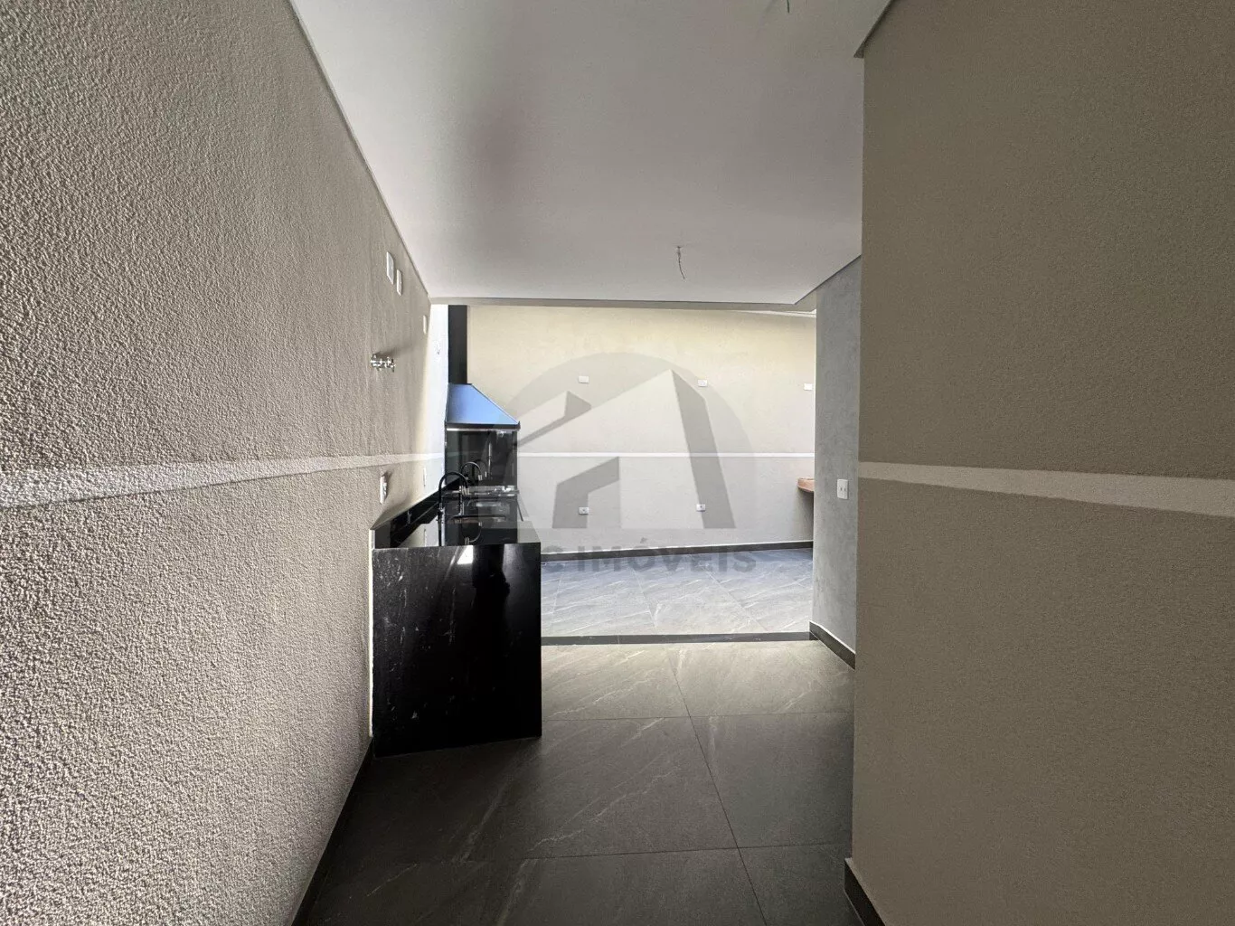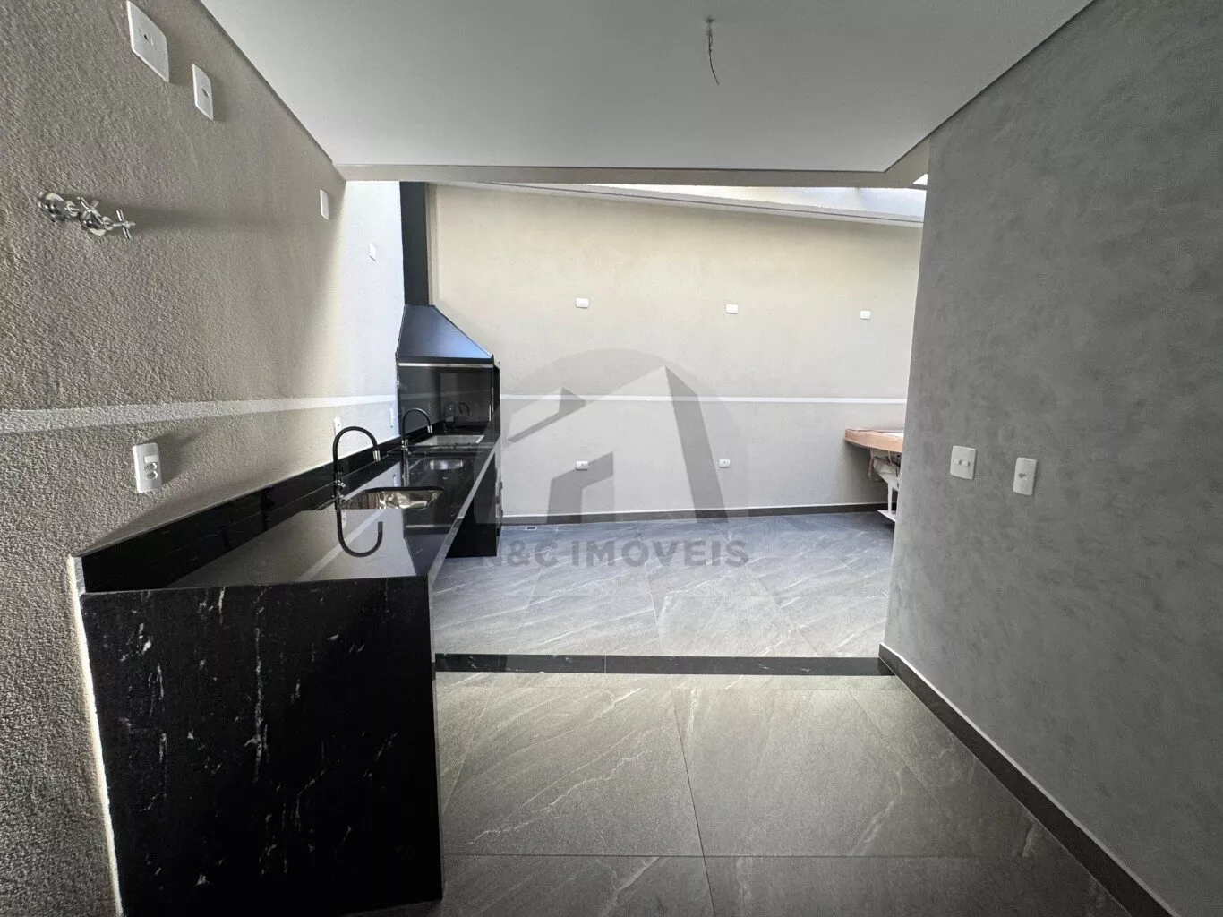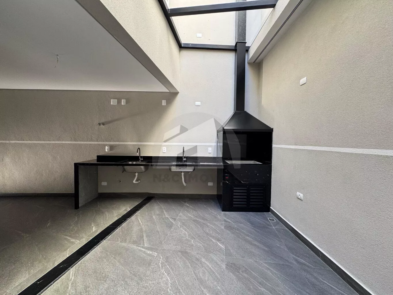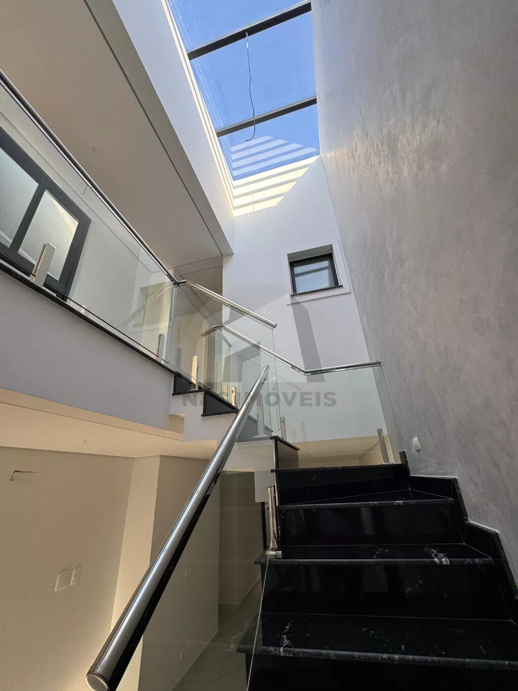 O corredor lateral dá acesso direto à charmosa área gourmet, equipada com churrasqueira coberta, duas pias e uma bancada em mármore, perfeita para momentos de lazer com a família e os amigos. Internamente, a sala integrada à cozinha oferece um ambiente amplo e acolhedor, ideal para quem valoriza espaços bem aproveitados. Um dos destaques é a claraboia, que proporciona iluminação natural à escada e parte da sala, deixando o ambiente ainda mais agradável e sofisticado.