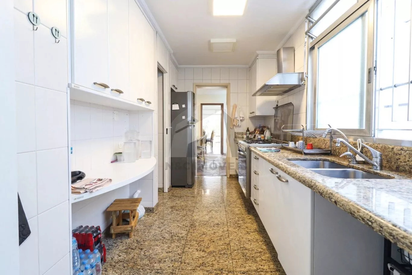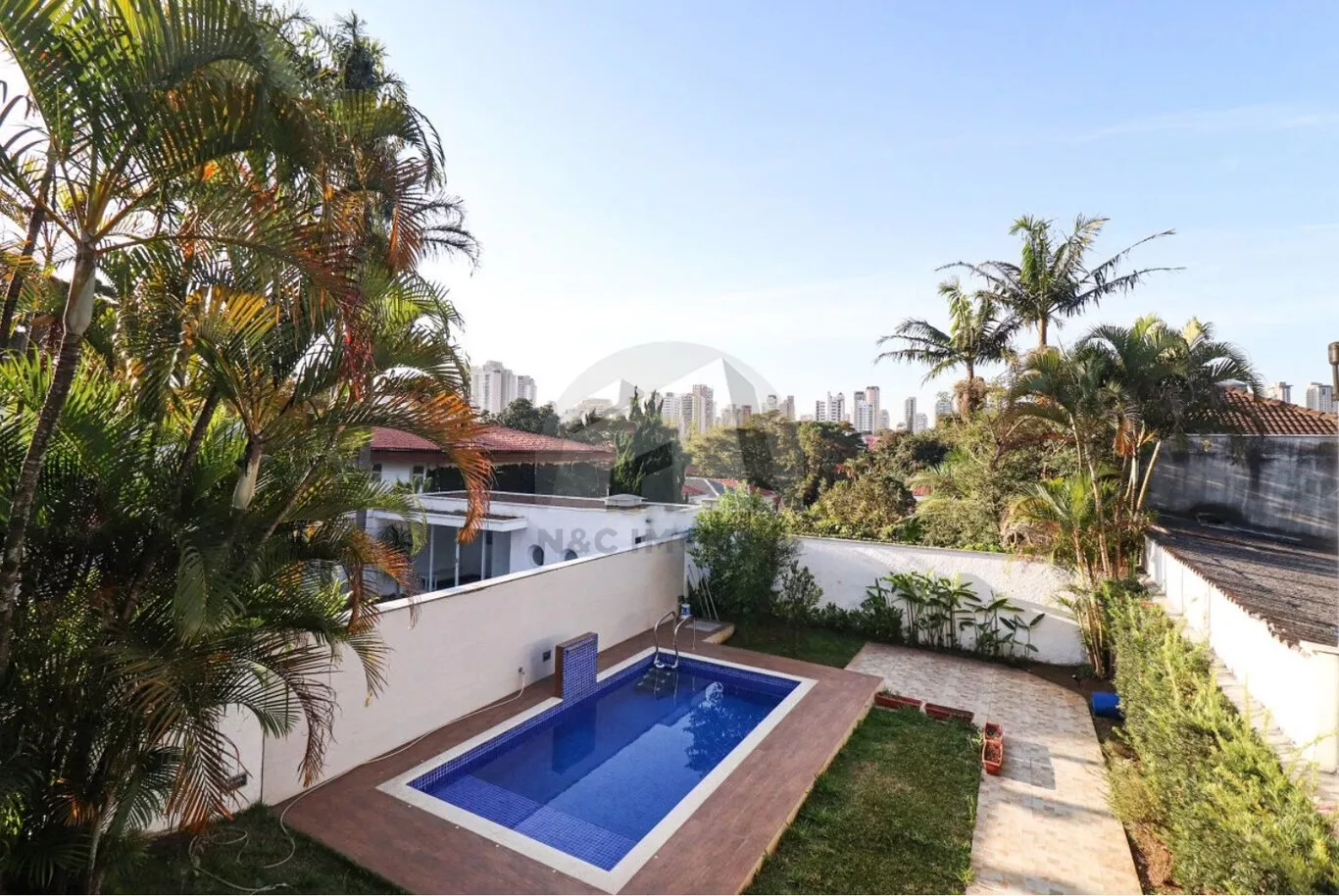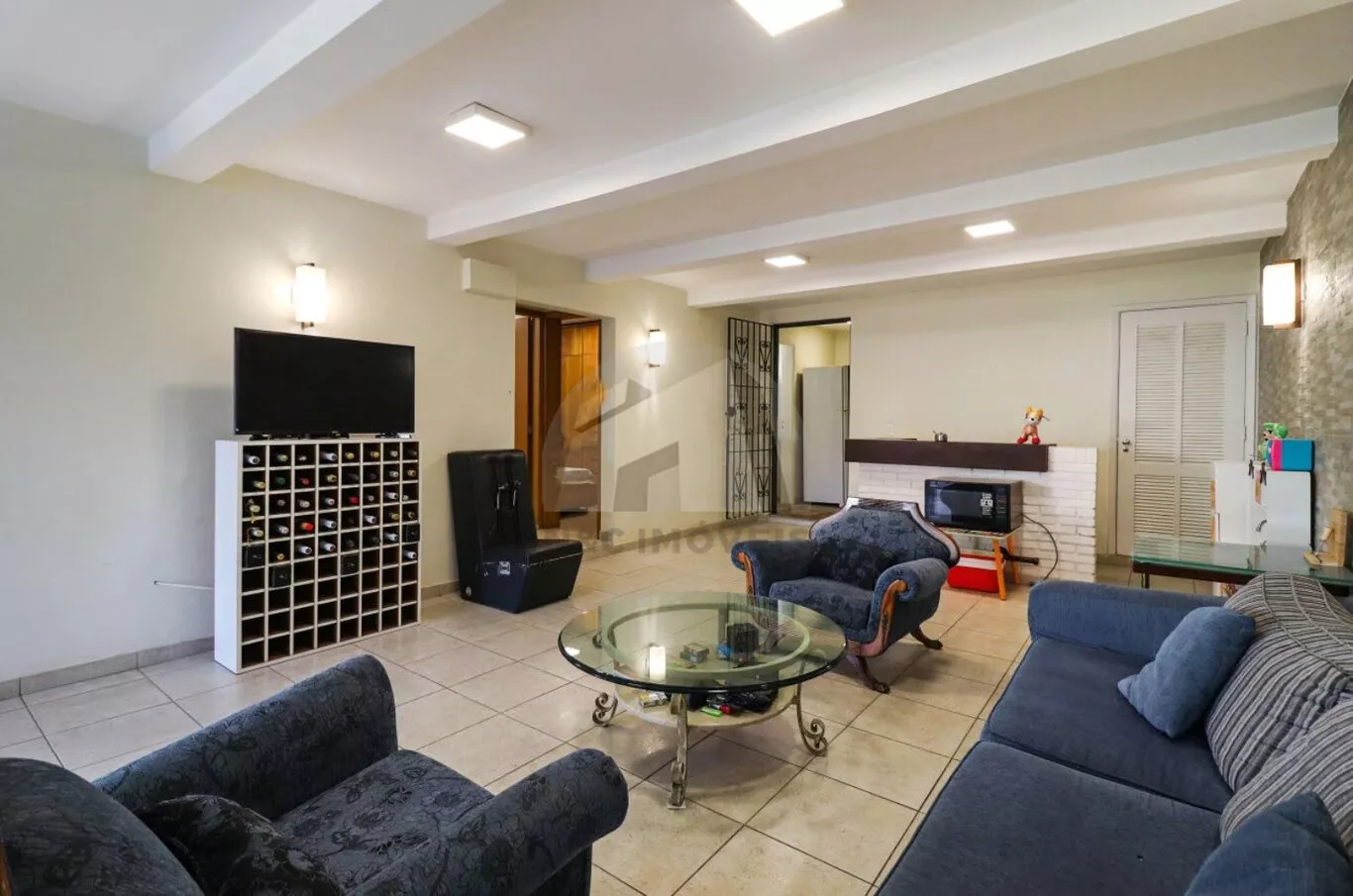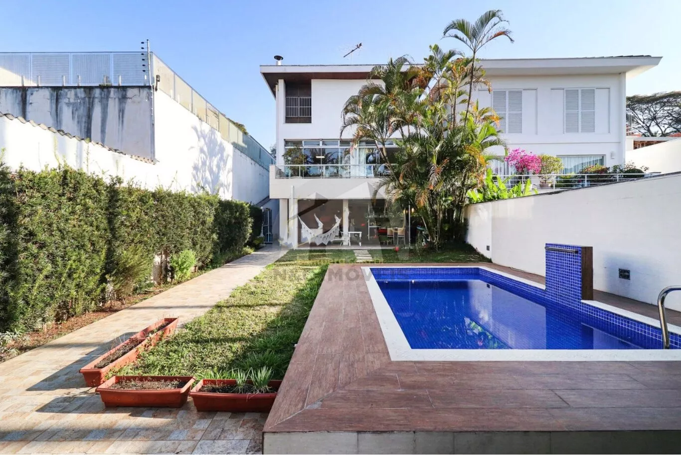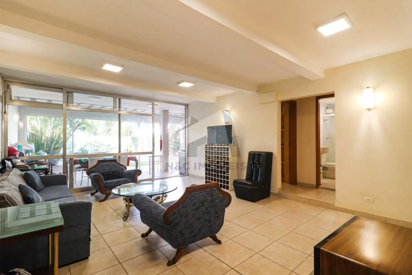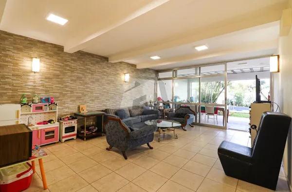 No pavimento inferior, destinado ao lazer e apoio, há uma sala ampla em dois ambientes, dois dormitórios no modelo americano com ar-condicionado, lavabo, depósito espaçoso e uma área de churrasqueira generosa, preparada para dois ambientes. O espaço se integra à área externa, que conta com jardim, piscina e banheiro de serviço.