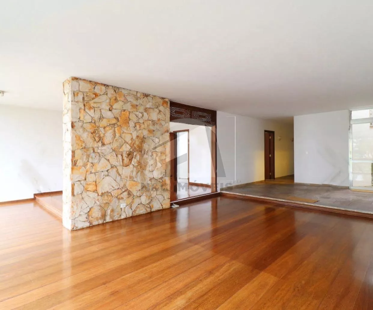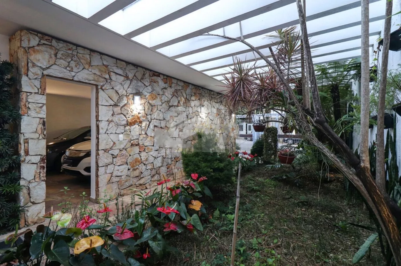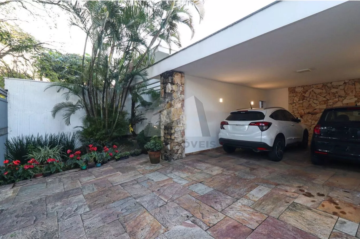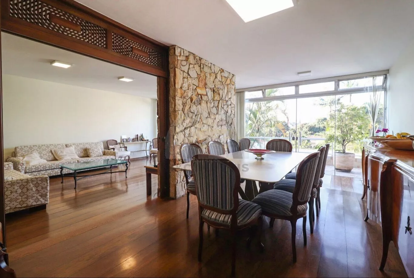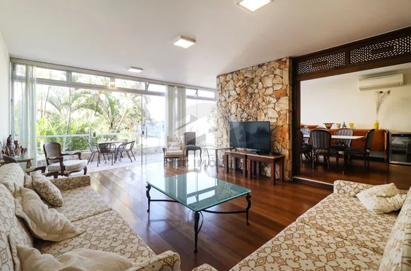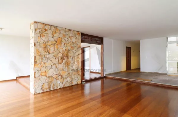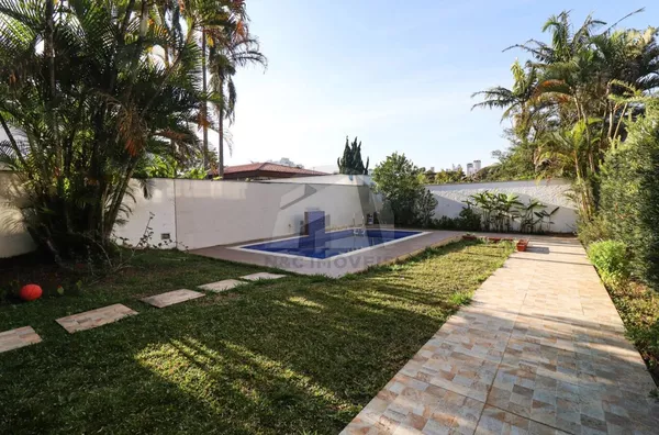 O pavimento térreo reúne as áreas sociais, com salas em três ambientes, sala de jantar, sala de lareira e um terraço amplo com vista à piscina. A cozinha é independente, com copa separada e despensa, além de lavabo, escritório com vista para o jardim, lavanderia e área anexa à cozinha, parcialmente coberta com vidro, ideal para apoio doméstico. A garagem comporta 4 veículos, acompanhada de jardim frontal.